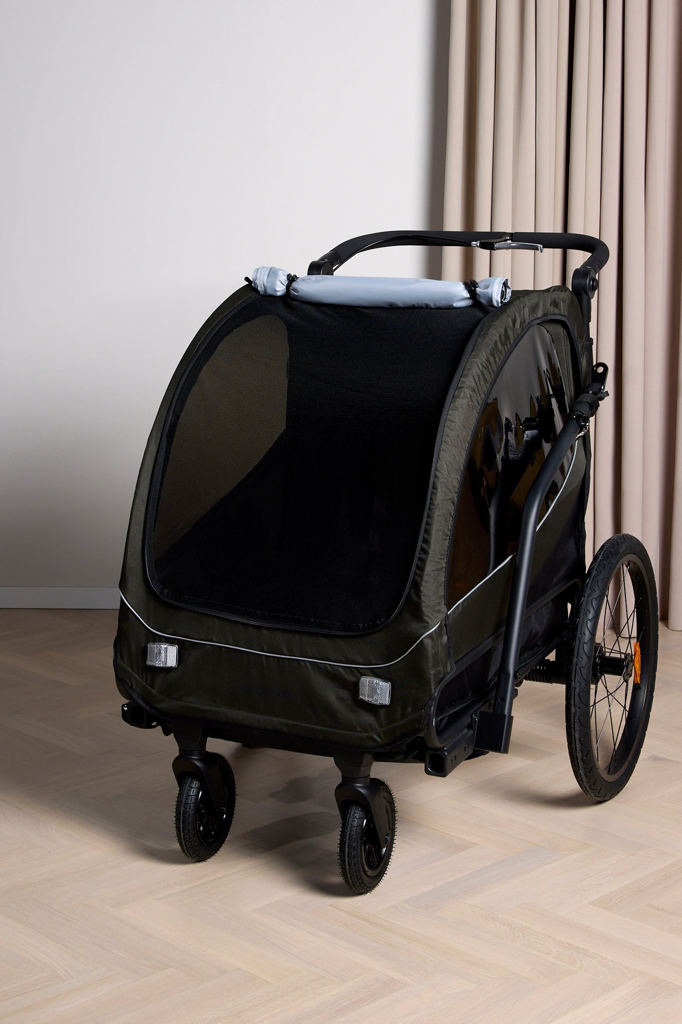– Medföljer svängbart framhjul för att kunna använda som barnvagn.