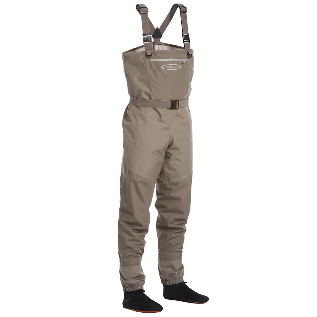 Vision Atom-vadarbyxorna är av god kvalitet men förmånliga. Atom-vadarbyxorna är väldigt slitstarka – de är helt och hållet tillverkade i ett material med 3 lager. Ändå är de lätta och sköna. Byxornas neoprensockor har förstärkt sula för att hålla ännu bättre. Hållbarheten har beaktats även i skärningen och sömmarna har minimerats på de ställen som vanligen slits mest. Byxorna har en stor blixtlåsförsedd bröstficka på utsidan och på insidan en vändbar ficka. Insidans ficka har ett kardborrband vid vilket du kan fästa en vattentät påse för små grejer.